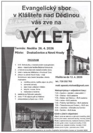 Evangelický sbor v Klášteře nad Dědinou Vás zve 26.4.2026 na výlet do Dvakačovic a Nových hradů.