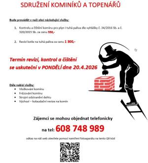 Sdružení kominíků a topenářů bude provádět v naší obci v PONDĚLÍ dne 20.4. požadované kontroly a čištění komínů pro plyn i tuhá paliva.