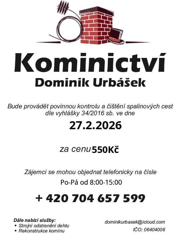 Kominictví Urbášek bude v naší obci dne 27.2.2026 provádět povinnou, každoroční kontrolu a čištění komínů a spalinových cest, od spotřebičů na pevná a plynná paliva.