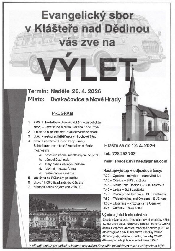 Evangelický sbor v Klášteře nad Dědinou Vás zve 26.4.2026 na výlet do Dvakačovic a Nových hradů. Přihlášení do 12.4.2026 na spacek.michael@gmail.com, tel.: 728252703