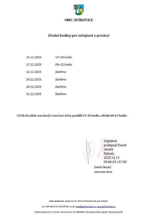 Úřední hodiny OÚ Jeníkovice v prosinci