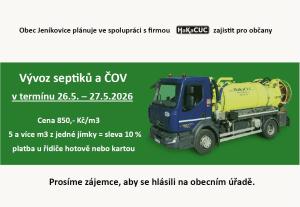 Obec Jeníkovice ve spolupráci s firmou HaKaCUC zajistí pro občany vývoz septiků a ČOV v termínu 26.5. -27.5.2026. Cena 850,-/m3 (5 a více m3 z jedné jímky = sleva 10%). Platba u řidiče hotově, nebo kartou. Prosíme zájemce, aby se hlásili na Obecním úřadě.